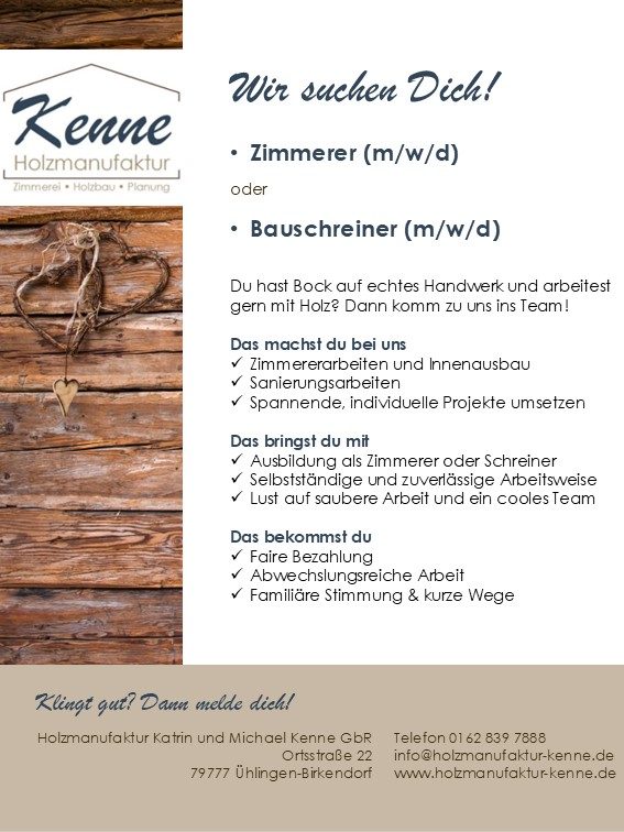 Wir suchen zum nächstmöglichen Zeitpunkt einen Zimmerer oder Schreiner, der Lust auf individuelle Projekte hat.