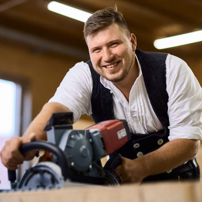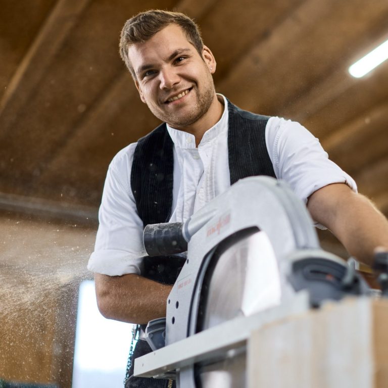 Mathias ist Zimmerer aus Leidenschaft – besonders, wenn es um Abbundarbeiten geht. Mit seinem Blick fürs Detail und seiner sorgfältigen Arbeitsweise sorgt er dafür, dass jedes Holzteil perfekt passt.